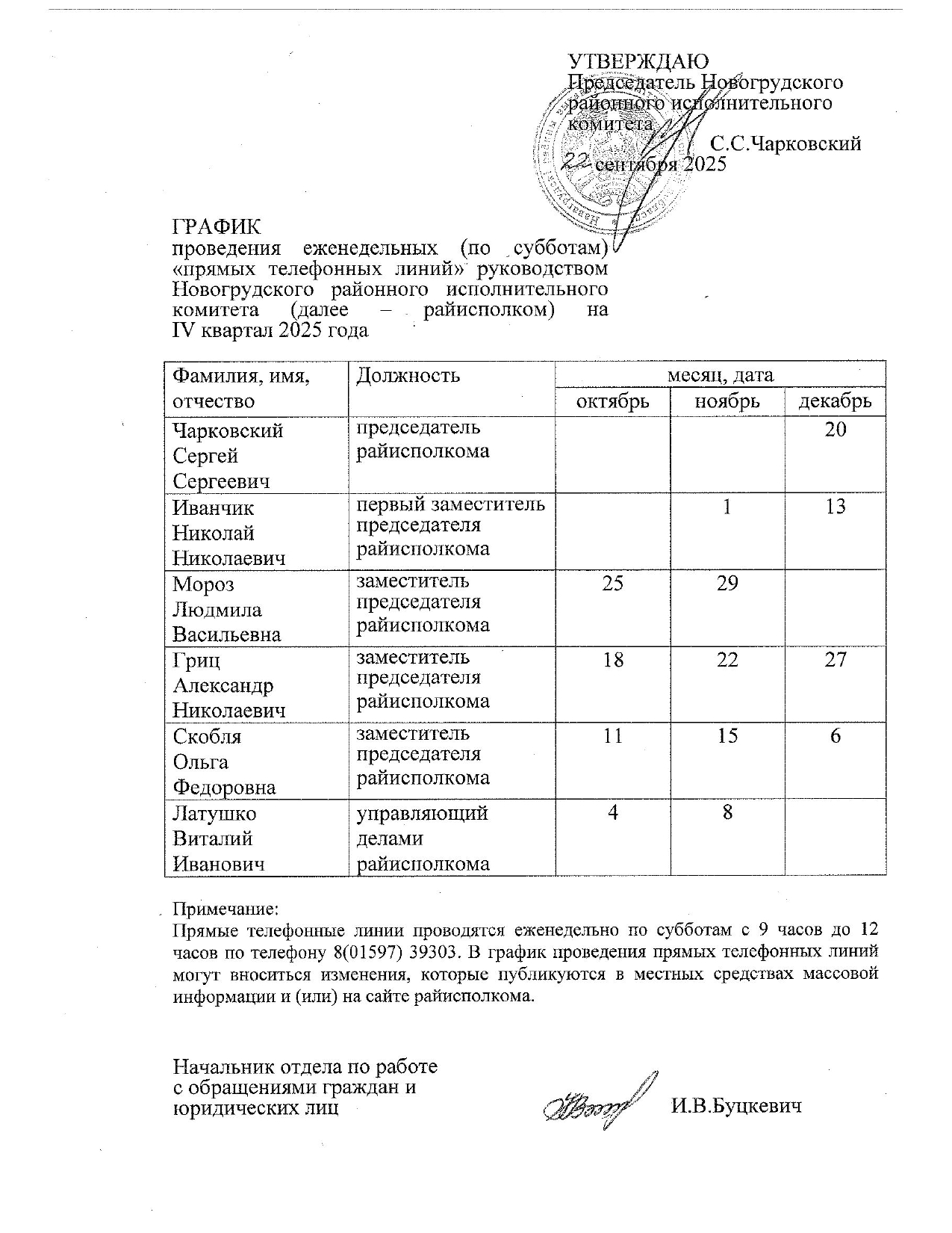 График проведения прямых телефонных линий руководством Новогрудского райисполкома
